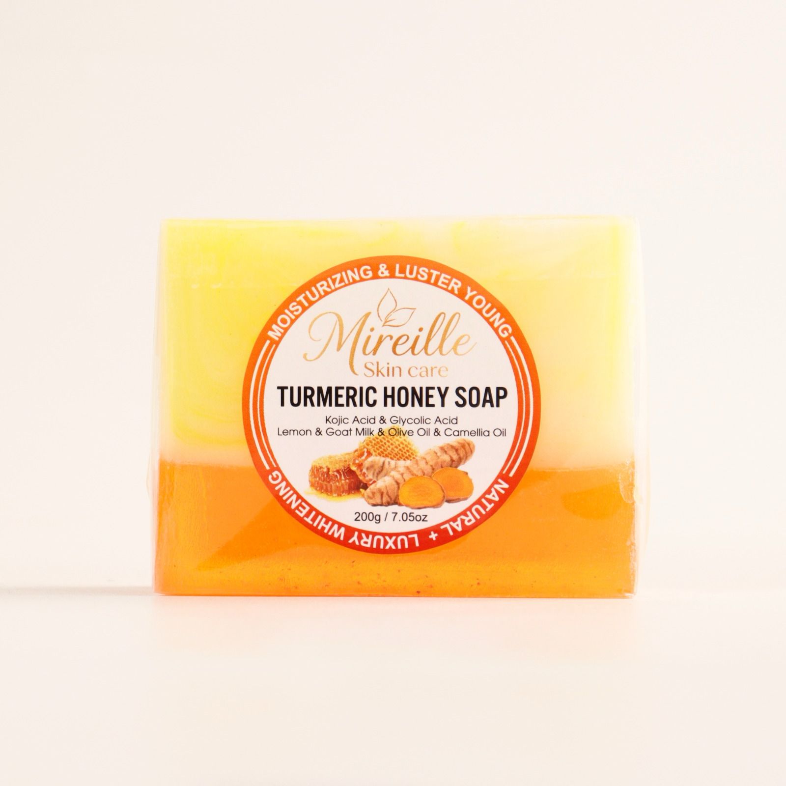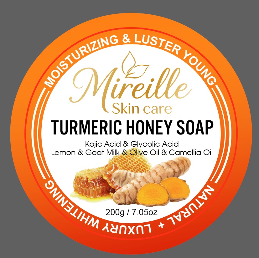 Mireille Skin Care Turmeric Honey Soap is formulated with turmeric, honey, kojic acid, and glycolic acid to gently cleanse, nourish, and enhance skin radiance.